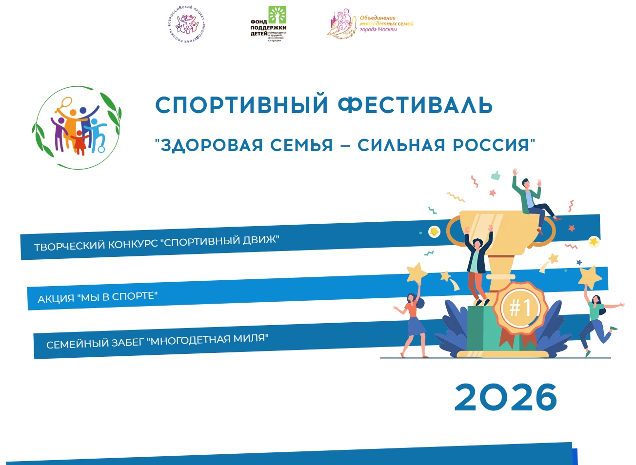 РОО «Объединение многодетных семей города Москвы» совместно с Фондом поддержки детей, находящихся в трудной жизненной ситуации, приглашают вас принять участие во Всероссийском спортивном фестивале «Здоровая семья — сильная Россия» в 2026 году!